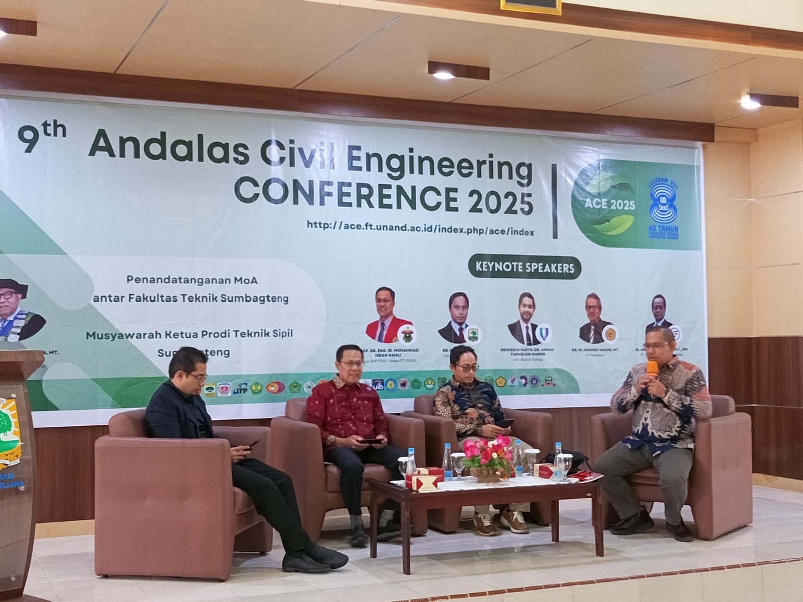 Sebagai bagian dari agenda utama, dilaksanakan penandatanganan Momerandum of Agreement (MOA) antar Dekan Fakultas Teknik Universitas/Institut/Sekolah Tinggi se-Sumatera Bagian Tengah bersama Dekan Fakultas Teknik Universitas Hasanuddin selaku Ketua Badan Musyawarah Perguruan Tinggi Teknik Sipil Seluruh Indonesia (BMPTTSSI) yang melibatkan jejaring kerjasama dari 30 Program Studi Teknik Sipil se-Sumatera Bagian Tengah (Sumbagteng) yaitu: Universitas Andalas (Host), Universitas Negeri Padang, Politeknik Negeri Padang, Universitas Dharma Andalas, Universitas Adzkia, Institut Teknologi Padang, Universitas Bung Hatta, Universitas Putra Indonesia “YPTK”, Sekolah Tinggi Teknologi Payakumbuh, Universitas Muhammadiyah Sumatera Barat, Universitas Ekasakti, Universitas Riau, Universitas Islam Riau, Universitas Lancang Kuning, Universitas Abdurrab, Universitas Jambi, Sekolah Tinggi Teknologi Pekanbaru, Universitas Pasir Pengaraian, Universitas Islam Kuantan Sengingi, Universitas Pahlawan Tuanku Tambusai, Bangkinang, Politeknik Bengkalis, Institut Teknologi dan Bisnis Inderagiri, Institut Teknologi Mitra Gama Duri, Universitas Bengkulu, Universitas Prof. Dr. Hazairin, SH, Sekolah Tinggi Ilmu Teknik Trisula, Universitas Internasional Batam, Universitas Batam, Universitas Riau Kepulauan, Universitas Muhammadiyah Bangka Belitung. Penandatanganan ini merupakan simbol komitmen bersama dalam membangun kolaborasi riset, pertukaran keilmuan, dan pengembangan kurikulum yang adaptif terhadap isu-isu aktual, khususnya di bidang rekayasa kebencanaan. Rangkaian kegiatan Seminar ACE 9 Tahun 2025 ini juga akan dilaksanakan Musyawarah Perdana forum “Jejaring Kerjasama Ketua Program Studi Teknik Sipil se-Sumatera Bagian Tengah (Sumbagteng)”.
