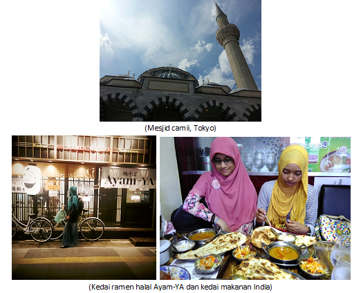 Wisata kuliner di Jepang bisa terbilang susah, karena Jepang bukan negara mayoritas Muslim seperti Indonesia. Jadi jika ingin membeli bahan makanan ataupun mengunjungi restoran harus pandai memilihnya, bisa dengan mengetahui kanji babi, alkohol dan bahan haram lainnya ataupun mencari di website seperti Halal Media Japan, Halal In Japan, dan sebagainya. Biasanya petugas swalayan di Jepang bersedia jika kita menanyakan suatu produk yang ingin kita beli itu halal atau tidak. Salah satu kedai ramen halal yang terkenal di Kyoto adalah Kedai Ayam-YA yang letaknya tidak jauh dari stasiun Kyoto. Jika pergi ke Tokyo, disekitar Mesjid Camii terdapat banyak kedai makanan halal. Salah satunya adalah kedai makan halal khas India yang sangat cocok dengan lidah orang Indonesia.