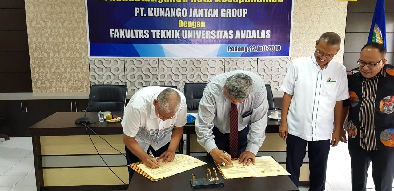 Kerjasama itu ditandai dengan ditandatanganinya nota kesepahaman (MoU) oleh Dekan Fakultas Teknik Universitas Andalas Ir. Insannul Kamil, M.eng, Ph.D., IPM, ASEAN Eng. dengan Owner dan Founder PT. Kunango Jantan Group H. Asril yang disaksikan secara langsung oleh Rektor Universitas Andalas Prof. Dr. Tafdil Husni, SE. MBA di Ruang sidang Dekanat Lt.2 Fakultas Teknik pada hari Jumat, 12 Juli 2019.