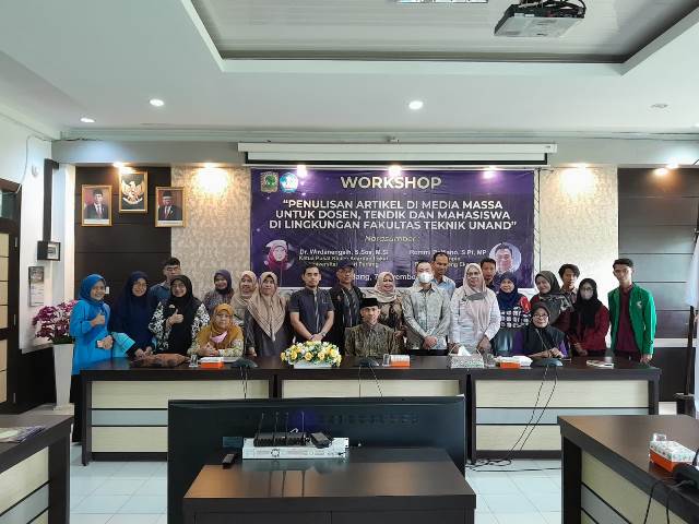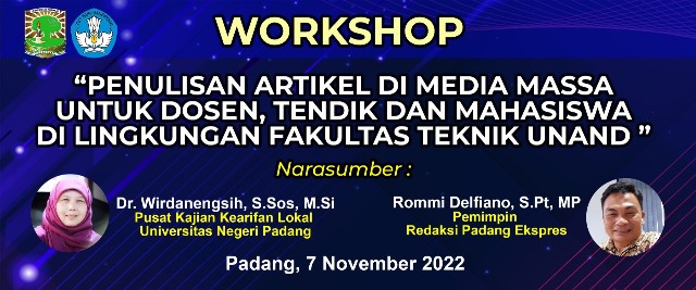 Padang- Dalam rangka meningkatkan motivasi dan kemampuan menulis artikel bagi Dosen, Tenaga Kependidikan dan Mahasiswa, Fakultas Teknik Unand menyelenggarakan kegiatan Workshop dengan topik : “ Urgensi dan Strategi Menulis Artikel di Media Populer dan Teknik Menulis Artiker Populer di Media Massa” pada hari Senin tanggal 7 November 2022 di Ruang Sidang Dekanat Lt. II Fakultas Teknik.