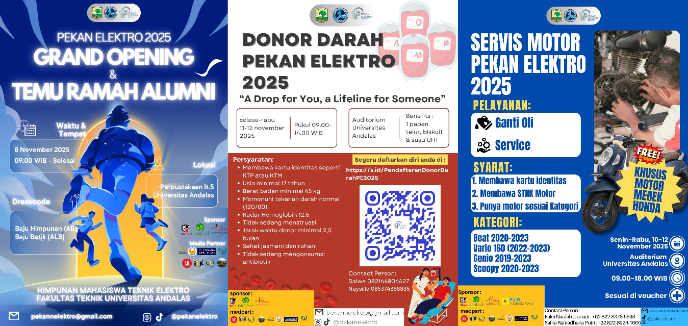 Dalam rangka menyemarakkan Pekan Elektro 2025, Himpunan Mahasiswa Teknik Elektro (HMTE) Fakultas Teknik Universitas Andalas menyelenggarakan berbagai kegiatan inspiratif dan bermanfaat bagi civitas akademika serta masyarakat umum. Rangkaian kegiatan ini meliputi acara pembukaan resmi, kegiatan sosial, hingga pelayanan teknis yang bertujuan mempererat kebersamaan dan memberikan kontribusi nyata bagi lingkungan sekitar.