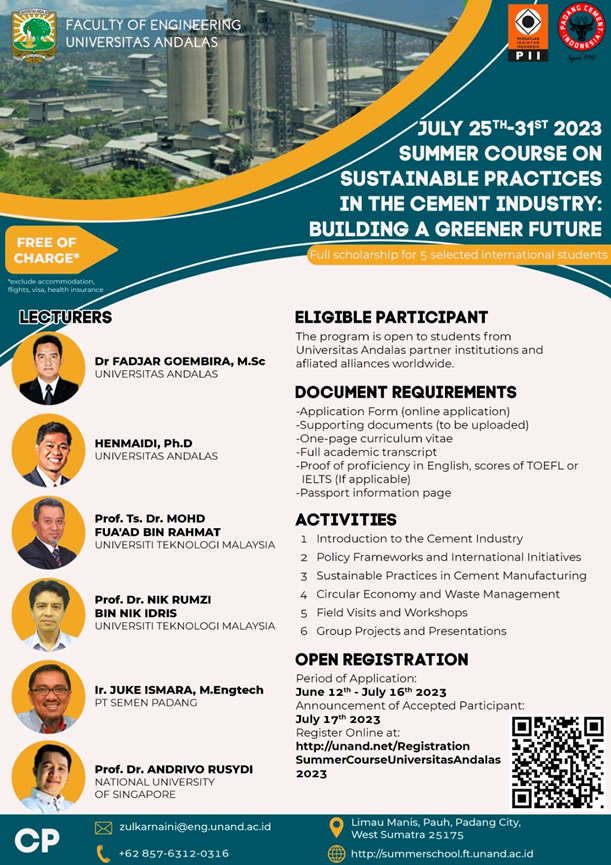 Padang (FTUA) – Fakultas Teknik Universitas Andalas akan menyelenggarakan kegiatan/program International Summer Course pada bulan Juli mendatang. Program ini direncanakan akan dilaksanakan selama satu minggu dari tanggal 25 Juli sampai 31 Juli 2023 dan akan terdiri dari kombinasi kuliah teori, studi kasus, lokakarya interaktif, dan kunjungan lapangan ke fasilitas produksi semen. Menghadirkan Narasumber Prof. Ts. Dr. Mohd Fua’ad Bin Rahmat dan Prof. Dr. Nik Rumzi Bin Nik Idris dari University Teknologi Malaysia, Prof. Dr. Andrivo Rusydi dari National University of Singapore, Ir. Juke Ismara, M.Engtech dari PT Semen Padang, Dr. Fadjar Goembira, M.Sc dan Henmaidi, Ph.D dari Universitas Andalas dengan mengusung tema : “Sustainable Practises in the Cement Industry : Building a Greener Future”.