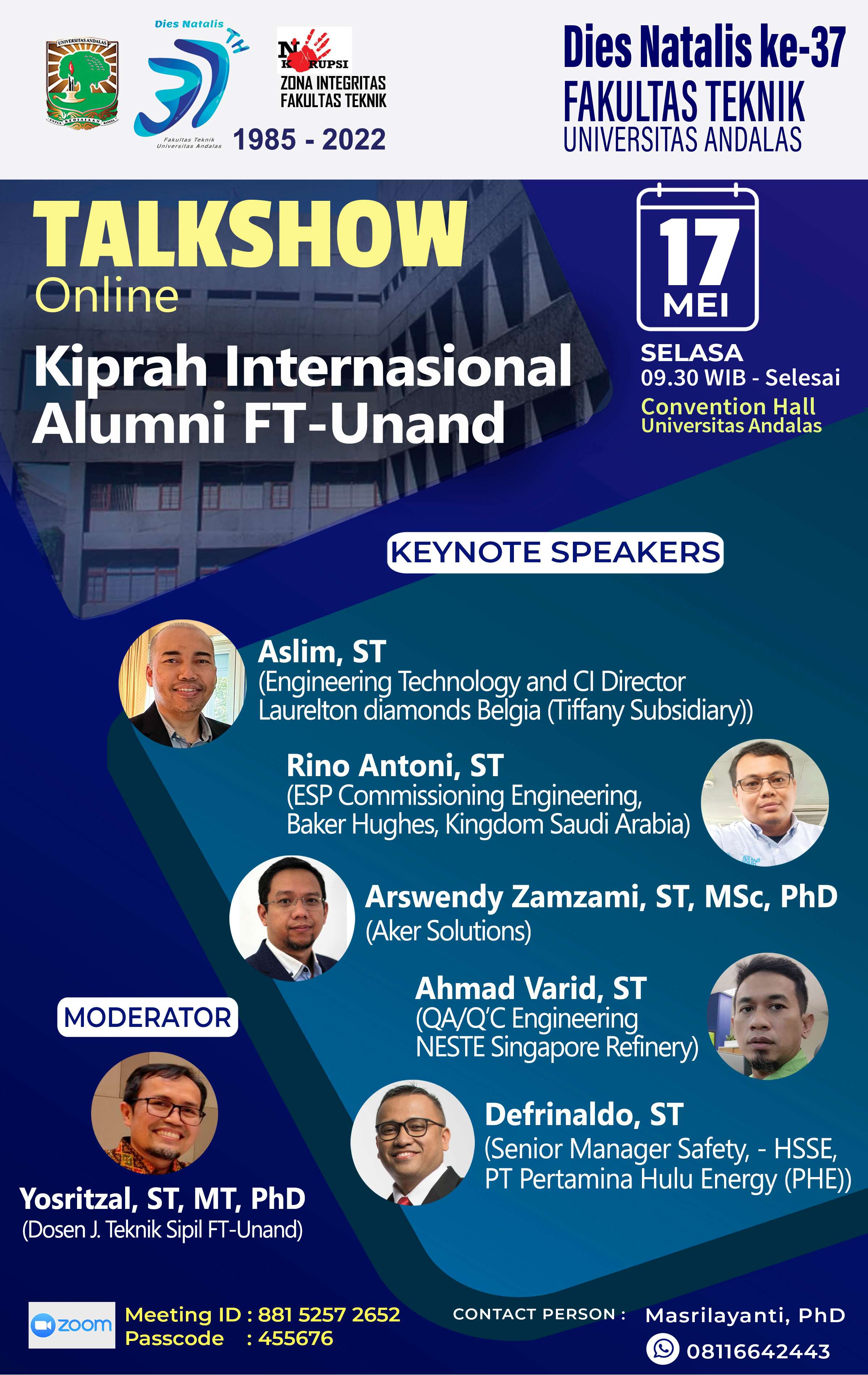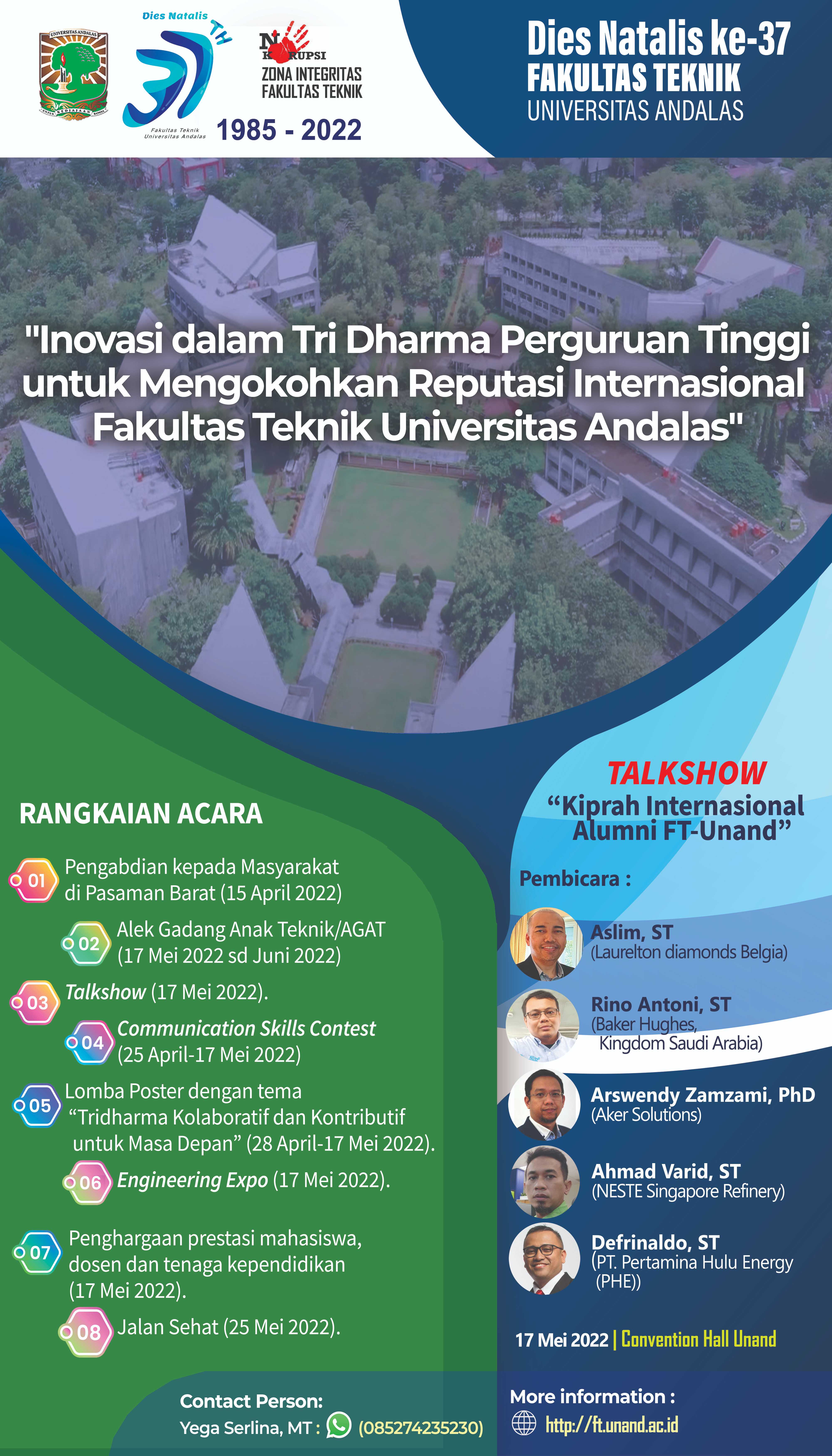 Kegiatan ini diselenggarakan 2 hari, tanggal 13 September 2022 di Ruang Pertemuan Pustaka Unand Lt. 5 dengan tema “Mengasah Leadership Skill sebagai Bekal Pemimpin Sukses di Masa Depan”. Dilanjutkan dengan Kuliah Umum di hari berikutnya tanggal 14 September 2022 di Gedung Convention Hall Universitas Andalas dengan tema “Skill Komunikasi unuk karir gemilang dan kesuksesan alumni” dengan menghadirkan narasumber Ir. Firdaus HB yang juga merupakan alumni Fakutas Teknik Unand.