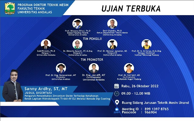 Dalam pemaparannya, promovendus mengangkat judul disertasi “Pengaruh Penambahan Zirconium Oxide terhadap Ketahanan Retak Lapisan Hidroksiapatit Ti-6Al-4V ELI melalui Metode Dip Coating” dibawah bimbingan Prof. Dr. Eng. Gunawarman, Dr. Eng. Jon Affi, dan Prof. Dr. Yuli Yetri.